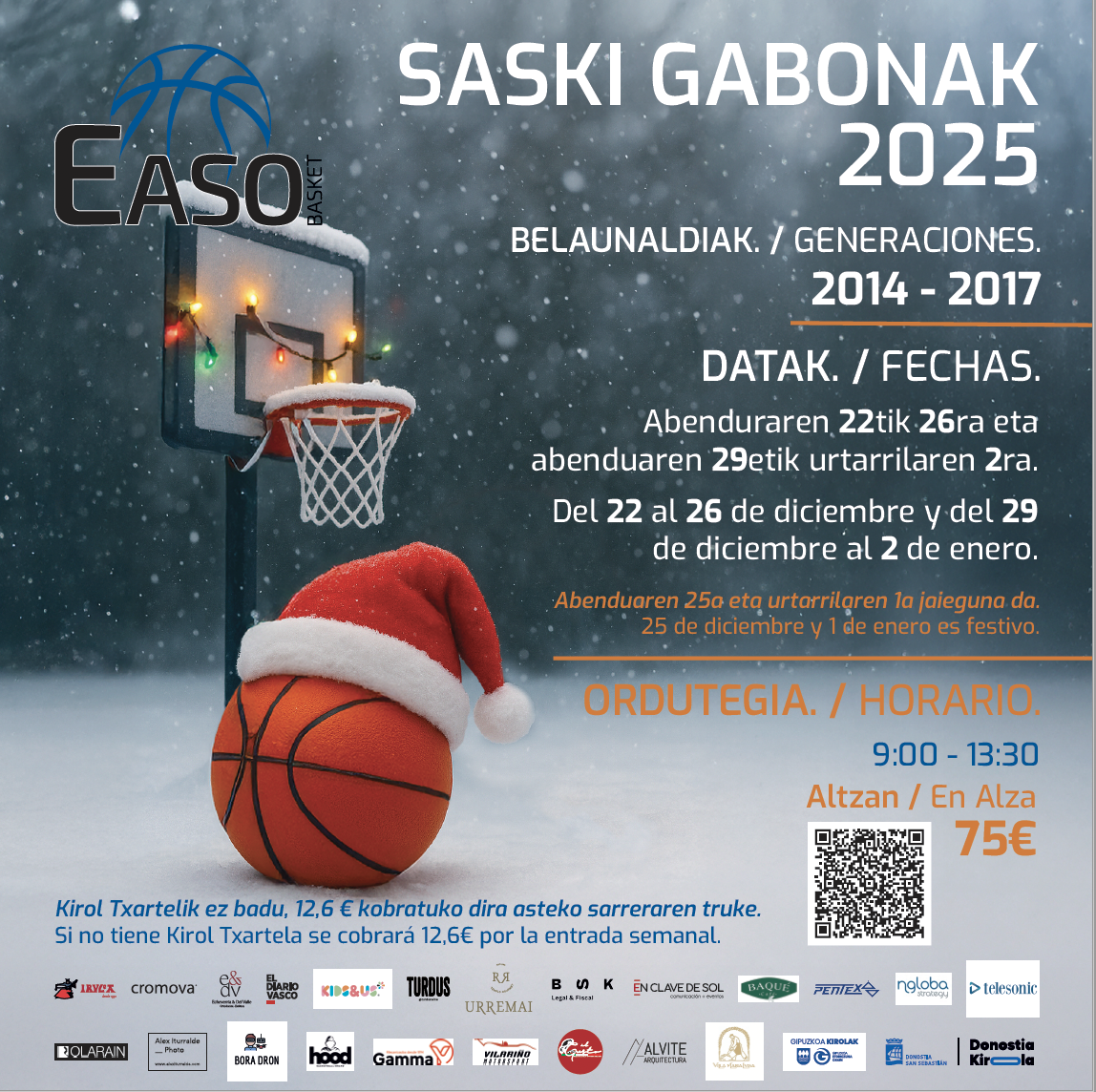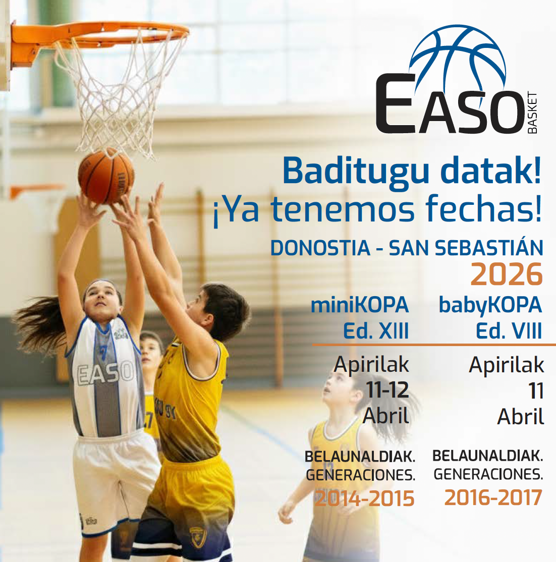 Juntos hasta lo más alto 001 ver más ver más El Club ver más ↗︎ ver más 002 ver más ver más Equipos ver más ↗︎ ver más 003 ver más ver más Eskola ver más ↗︎ ver más ¿Quieres entrar a formar parte de la familia EASO Basket? ESKOLA 2013 – 2016 Apúntate Darse de baja INFANTIL, CADETE, JUNIOR Y SENIOR 2012 Y ANTERIORES Apúntate Darse de baja ¿Quieres entrar a formar parte de la familia EASO Basket? ESKOLA 2012 – 2015 Apúntate INFANTIL, CADETE, JUNIOR Y SENIOR 2011 Y ANTERIORES Apúntate Apúntate ¿Estás interesad@ en ser parte de nuestro club? Así, a cambio de una simbólica cuota apoyarás al club y nos ayudarás a seguir creciendo y apostando por el basket de base. ¡Ah! Y como socio del club, podrás votar en la asamblea anual. Convenio IBAETA Convenio GIPUZKOA Eventos Minikopa / Babykopa 2024 Ver todos Noticias recientes SASKI GABONAK 2025 Leer más MINIKOPA – BABYKOPA 2026 Leer más PUERTAS ABIERTAS 2025 – ESKOLA EASO BASKET Leer más ionicons-v5-e Tienda Código de entrada 1750P ver más ver más Patrocinadores