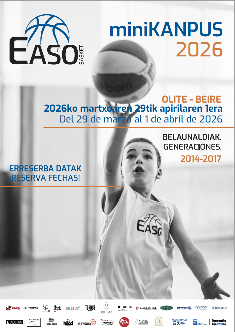 Juntos hasta lo más alto 001 ver más ver más El Club ver más ↗︎ ver más 002 ver más ver más Equipos ver más ↗︎ ver más 003 ver más ver más Eskola ver más ↗︎ ver más ¿Quieres entrar a formar parte de la familia EASO Basket? ESKOLA 2013 – 2016 Apúntate Darse de baja INFANTIL, CADETE, JUNIOR Y SENIOR 2012 Y ANTERIORES Apúntate Darse de baja ¿Quieres entrar a formar parte de la familia EASO Basket? ESKOLA 2012 – 2015 Apúntate INFANTIL, CADETE, JUNIOR Y SENIOR 2011 Y ANTERIORES Apúntate Apúntate ¿Estás interesad@ en ser parte de nuestro club? Así, a cambio de una simbólica cuota apoyarás al club y nos ayudarás a seguir creciendo y apostando por el basket de base. ¡Ah! Y como socio del club, podrás votar en la asamblea anual. Convenio IBAETA Convenio GIPUZKOA Eventos Minikopa / Babykopa 2024 Ver todos Noticias recientes miniKANPUS 2026 Beire / Olite Leer más SASKI GABONAK 2025 Leer más MINIKOPA – BABYKOPA 2026 Leer más ionicons-v5-e Tienda Código de entrada 1750P ver más ver más Patrocinadores